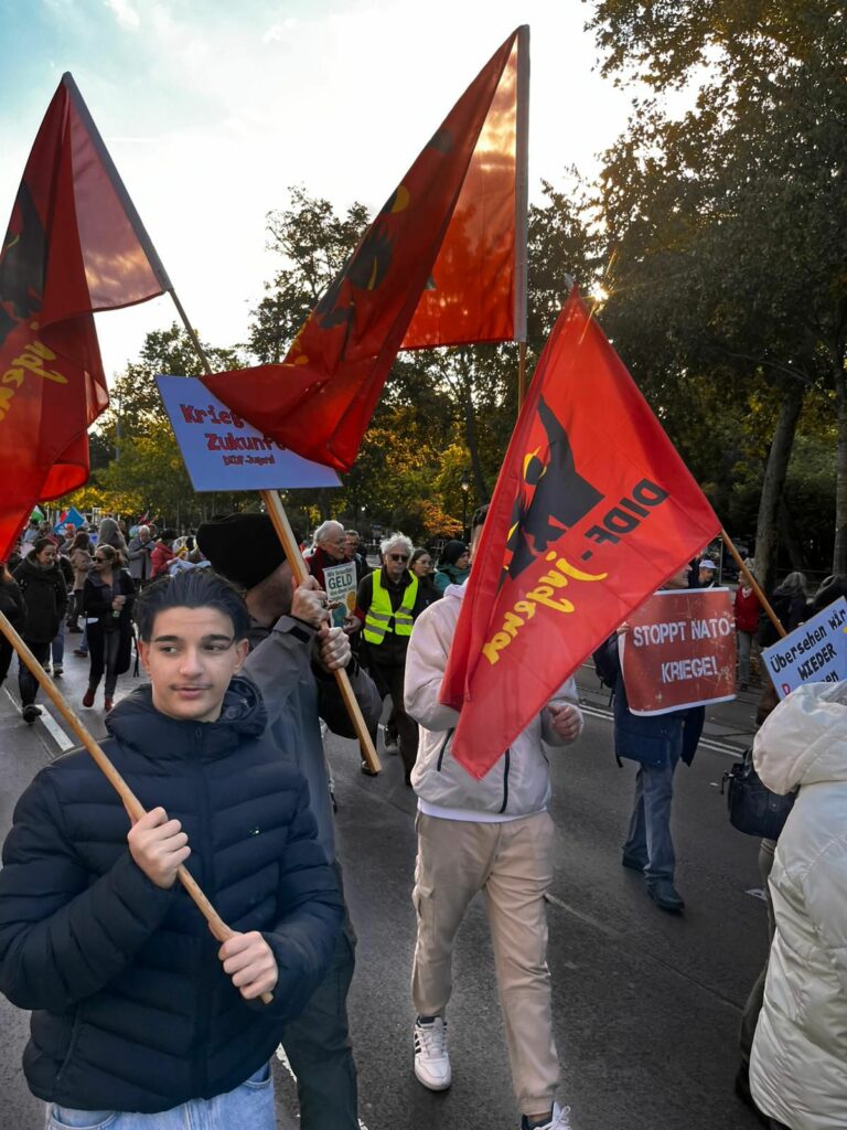 Sevgili dostlar, sevgili yoldaşlar, Bugün burada, sadece bir askeri ittifakı değil, aynı zamanda sömürü ve savaş makinesini de teşhir etmek için toplandık: NATO’yu. 1949’dan bu yana NATO, “özgürlük” ve “güvenlik” sloganlarıyla sahneye çıkıyor. Oysa gerçekte NATO, sermayenin çıkarlarını ve emperyalist düzenin sürekliliğini garanti ediyor. Kore’den Vietnam’a, Yugoslavya’dan Afganistan’a, Libya’dan Irak’a kadar — her yerde NATO kan ve yıkımın adı oldu. Her zaman “barış” vaadiyle geldi, ama geriye kalan yağma, işgal ve milyonlarca mülteci oldu. Filistin halkına yönelik katliam karşısında bile NATO sessiz kalıyor — bu sessizlik suç ortaklığıdır. İsrail’in işgaline verilen siyasi, ekonomik ve askeri destek, bu paktın kanlı bilançosuna ekleniyor. Gazze’de bombalar altında çığlık atan çocukların sesi, NATO’nun gerçek yüzünü bir kez daha gösteriyor: emperyalist düzenin polisi. Biz, Avusturya’daki işçiler, göçmenler ve gençler, kendi tarihimizden biliyoruz: Avusturya’nın tarafsızlığı kolay kazanılmadı. Bu, ülkenin en önemli kazanımlarından biridir. Ama yıllardır NATO yanlısı politikacılar, ülkemizi bu savaş makinesine bağlamaya çalışıyor. Avusturya’daki NATO tatbikatları, silah sevkiyatları ve askeri iş birlikleri tarafsızlığın ihlali olur. Bunu kabul etmeyeceğiz! Tarafsızlık demek, savaş bloklarının bir parçası olmamak demektir. Tarafsızlık demek, Avusturya topraklarının emperyalist saldırganlık için üs olmaması demektir. Tarafsızlık demek, Filistin’de ezilenlerle, Latin Amerika’daki direniş hareketleriyle ve Afrika’daki sömürgecilik karşıtı mücadelelerle dayanışma içinde olmak demektir. Bugün NATO’ya “Hayır” demek: Savaşlara hayır, işgallere hayır, sömürüye hayır demektir. Biz biliyoruz ki, halkların çıkarları ne Brüksel’deki NATO karargâhında, ne de Washington’daki Pentagon masalarında bulunur. Halkların çıkarları, kendi örgütlenmelerinde, dayanışmalarında ve ortak mücadelelerinde vardır. Haydi hep birlikte haykıralım: