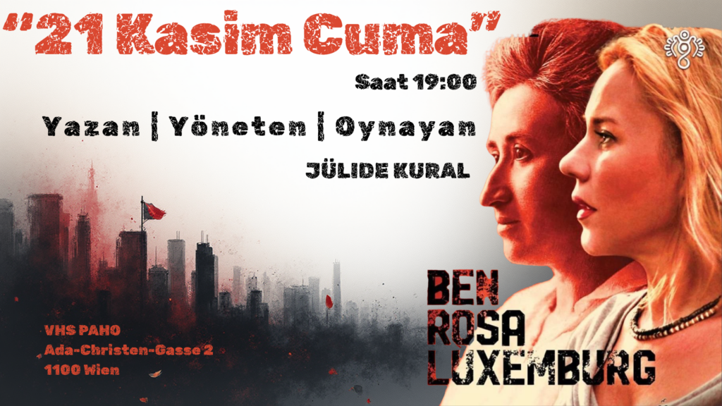 21 Kasım Cuma akşamı saat 19:00’da, izleyicileri düşünmeye, hissetmeye ve tarihle yüzleşmeye davet eden güçlü bir tiyatro deneyimi sizleri bekliyor. Ben Rosa Luxemburg adlı tek kişilik oyun, devrimci düşünür ve politik aktivist Rosa Luxemburg’un yaşamına, mücadelesine ve fikirlerine sahneden ışık tutuyor.